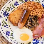 Famous place to stay in a lovely area. Savoury breakfast with sausages, hot toasts, cheese, obliging workers. The hotel of choice in Edinburgh.